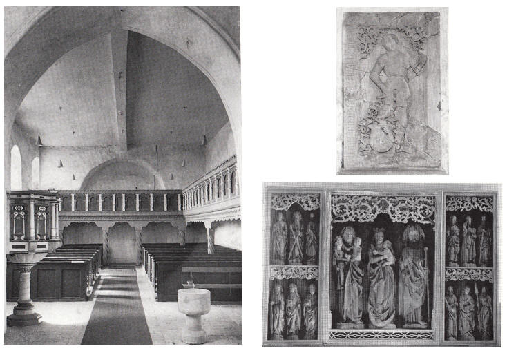 Kanzel um Mitte 17. Jahrhundert. Taufstein 1551. Empore an der West- und